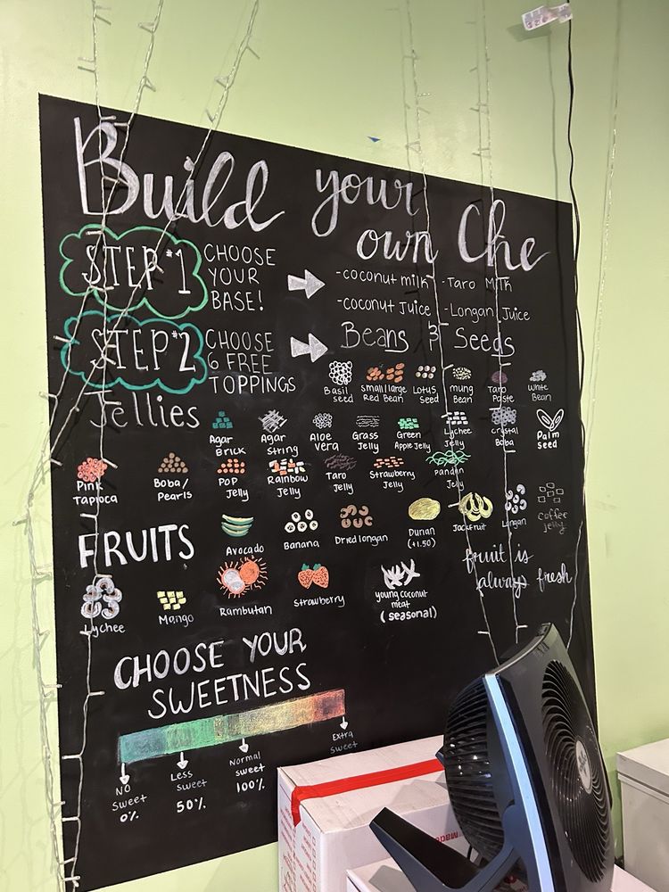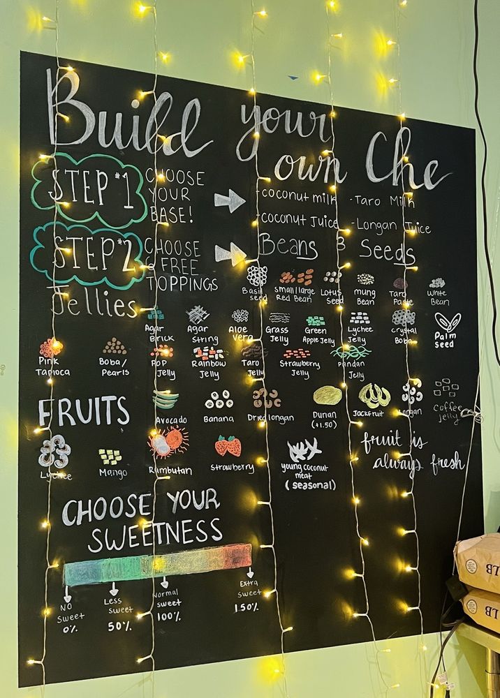Agar brick, agar string, jackfruit, mango, longan, lychee, palm seed, rambutan, young coconut meat, aloe vera, pink tapioca, rainbow jelly, pandan jelly, taro jelly, cendol and fresh coconut milk.